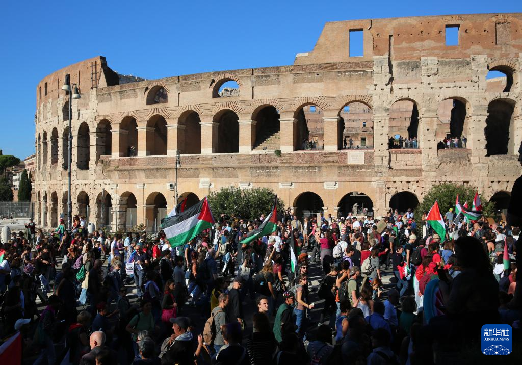 10月4日,在意大利罗马,罗马斗兽场通过了游行。以色列海军中断了“全球艰难的舰队”,该舰队将人道主义材料从第1至2日到达加沙地带到达高海,并在船上占领了400多人。政治界和许多欧洲国家的人民做出了强烈的反应,要求以色列遵守国际法,确保受到密闭人员的安全,并停止对加沙地带的军事行动。最近几天,意大利许多地区的大规模抗议活动爆发,罗马,米兰和其他地方的成千上万人被带到街头支持巴勒斯坦。新华社的照片记者李金