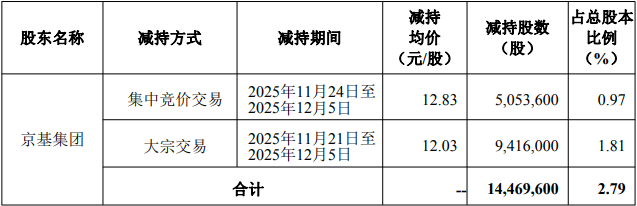 中国经济网北京12月9日电京基智农(000048.SZ)昨日晚间发布关于提前结束控股减持及减持比例达到1%以上整数的公告及减持结果。 2025年12月5日下午,公司收到东京基地集团控股股东关于提前终止减员计划及减员实施结果的通知。京基集团于2025年11月24日至2025年12月5日期间通过集中竞价减持公司股份5,053,600股,占公司总股本的0.97%。平均折扣价为12.83元。 / 分享; 2025年11月21日至2025年12月5日,公司大宗交易减持股份941.6万股,占总股本的1.81%,减持均价12.03元/股。从2025年11月21日到截至2025年12月5日,京基集团股份数量达到14,469,600股。经测算,京基集团持股减持值为1.78亿元。本次减持后,京基集团及其关联方京基时代持有的股份总数由274,140,625股减少至261,171,025股,占公司总股本的52.82%。 2025年12月5日实施减持后,京基集团及合并方股权变动达到1%的重要倍数。据新浪财经了解,京基集团初始持股2.25亿股,占新增股本的43.04%。 2022年7月4日起,京基集团首次减持京基智农股份。 2022年7月,减持公司股票2600万股,解除合计5.11亿元。 2024年11月15日,京基智农披露制定《2024年一定目标发行股票预案(修正后)》。公司拟向包括东京控股股东在内的不超过35名合格投资者发行A股,募集资金总额不超过19.3亿元人民币,将用于京基智慧云浮生猪养殖一体化项目、京基智慧和寿生猪养殖基地项目及增加流动资金。发行股份数量将不超过约1.59亿股(即发行前总股本的30%)。所有发行对象均以现金方式认购本次发行股份。