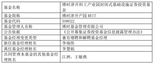 中国经济网北京10月17日电 今日,博时基金公告称,博时金产业园REIT聘任李瑞伟,李慧娟辞职。信息显示,李瑞伟2006年至2009年在上海海神投资管理有限公司担任交易员; 2012年至2014年担任启迪控股园区/开发总监; 2014年至2020年担任郑州启迪控股科技园开发商、展览有限公司/总经理; 2020-2024 昆明运达启迪科技园发展有限公司/总经理; 2023年-2024年 腾冲启迪永安科技城发展有限公司/总经理; 2024年至今 博时基金管理有限公司/ 历任博时交易者基金、蛇口产业园封闭式基础设施证券投资基金、博时金开产业园封闭式基础设施证券投资基金的管理人sed基础设施证券投资基金目前是一只基金中的基金。