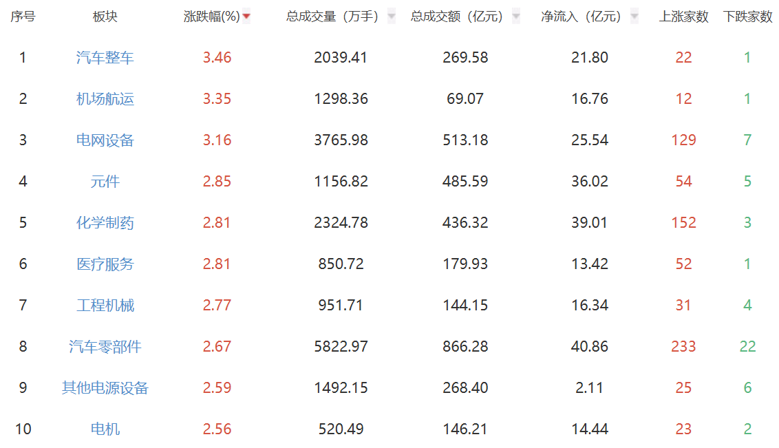 中国经济网北京10月15日电今日A股三大指数集体上涨。截至收盘,上证指数报3912.21点,涨幅1.22%,成交额9615.52亿元;深成指报1311 8.75点,涨幅1.73%,成交额11113.06亿元;创业板指数报3025.87点,上涨2.36%,成交金额4886.36亿元。分板块看,汽车、机场航运、电网设备等板块涨幅居前,港口航运、小金属、种植业、林业等板块跌幅居前。 A股市场板块盈亏排名
