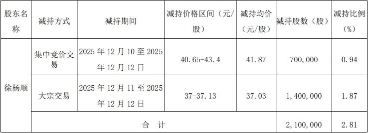 中国经济网北京12月15日电 拓山重工(001226.SZ)12月12日晚间发布公告,关于控股股东、实际控制人减持股份至1%的完整倍数并完成减持计划实施。近日,公司收到控股股东、实际控制人徐阳顺发出的《关于减持股权比例达到1%整数倍并完成减持计划实施的通知函》。 2025年12月12日,徐养顺通过集中竞价交易减持公司股份31.51万股,占公司总股本的0.42%;他还通过大宗交易减持了公司股份30万股,占公司总股本的0.40%。合计减持615,100股,计占公司总股本的0.82%。本次股权变更后,徐养顺及其关联方徐建峰、尤一云、广德广和共同持有公司股份由5,451.51万股变更为53,90,000股,占公司总股本的比例由73.01%下降至73.01.9%。权益变动为1%的整数倍。截至本公告日,徐阳顺的减持计划已完成。 2025年12月10日至2025年12月12日,徐养顺通过集中竞价交易减持70万股,减持比例0.94%,平均减持价41.87元/股; 2025年12月11日至2025年12月12日,徐养顺通过大宗交易减持140万股,减持比例1.87%,减持均价37.03元/股。 2025年12月10日至2025年12月12日,徐阳顺减持210万股票。经测算,减少总额为8115.1万元。拓山重工于2022年6月22日在深圳证券交易所主板挂牌上市,首次公开发行股票数量为1866.67万股,全部为新股,未安排旧股转让。其中,网上发行1866.65万股,占发行总量的99.9989%。深圳证券交易所新股网上申购未达到500股的剩余200股由保荐机构(主承销商)承销,发行价格为24.66元/股。保荐人(主承销商)为民生证券股份有限公司(现国联民生证券股份有限公司),保荐代表人为黄益民、鞠涛。拓山重工首次公开发行募集资金总额46,032.08万元,募集净额40,204.41万元元。公司2022年5月18日发布的招股书显示,公司拟募集资金用于安徽驼山重工股份有限公司智能生产线建设项目、安徽驼山重工股份有限公司研发中心建设项目以及增加流动资金。拓山重工发行总费用为5827.67万元(所有费用均不含税),其中保荐及承销费用为3600万元。