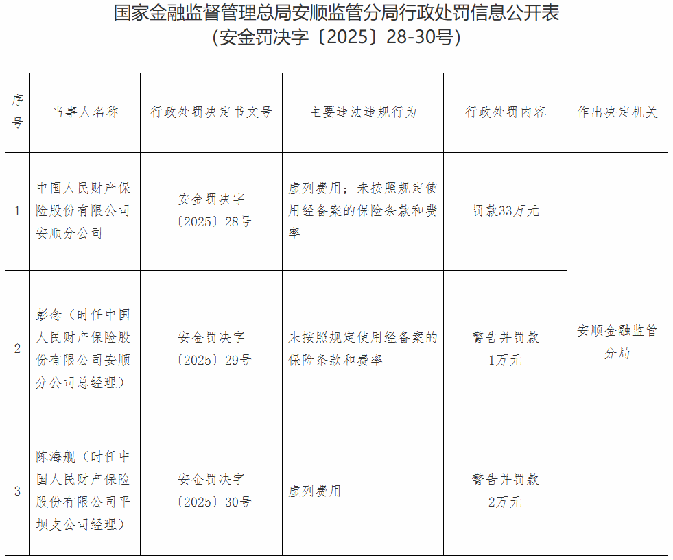 中国经济网北京12月25日电国家金融监督管理局网站昨日公布的安顺监管局行政处罚信息公示表(安金行决字[2025]28-30号)显示,中国人民财产保险股份有限公司安顺分公司费用列报错误;未按照规定使用经登记的保险条款和价格的。安顺市金融监管局对其处以罚款33万元。彭念(时任中国人民财产保险股份有限公司安顺分公司总经理)对未按照规定使用登记条款和保险费率的违法违规行为承担责任。安顺市金融监管局给予其警告,并罚款1万元。陈海健(时任中国人民财产保险股份有限公司平坝分公司经理)违法违规造假行为负有责任伊利上市费用。安顺市金融监管局对其给予警告,并罚款2万元。以下为原文: